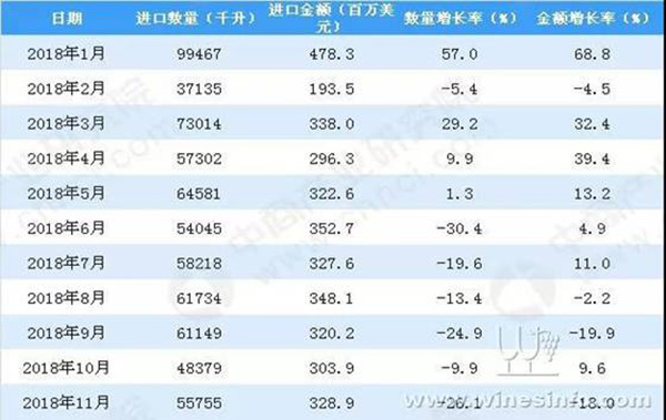 2018年1-11月中国葡萄酒进口数量及金额增长率情况